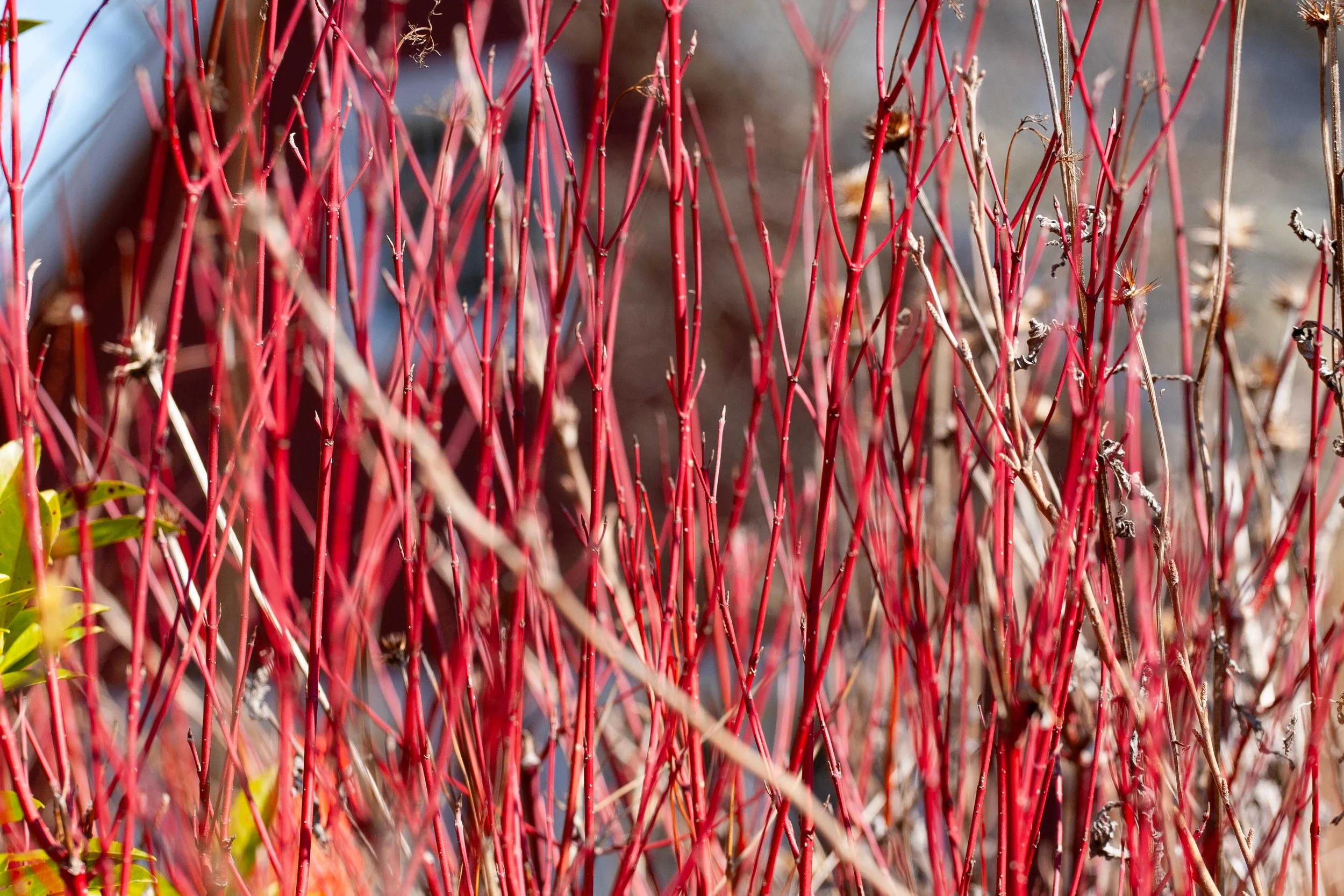 You may ask why I am writing about winter color in March. The reason is that if you want to achieve this bright red color throughout the winter, the time to prune this shrub back is in March. You can prune the stems very close to the ground to encourage new, red shoots to come up because as the stems age, they begin to lose their color and become browner as they mature. Pruning every 2 or 3 years will bring the color of new stems back to the garden.