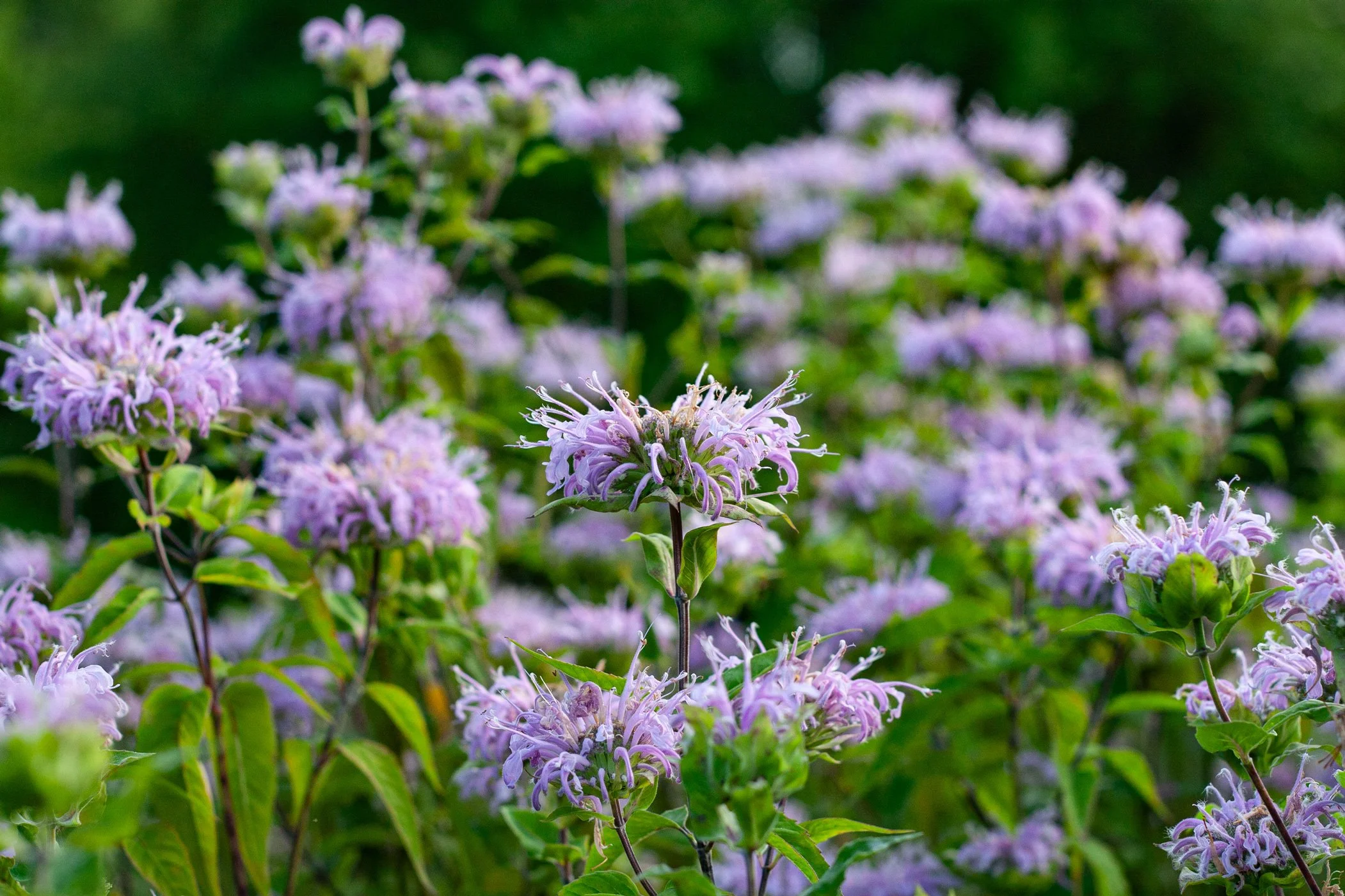 Monarda fistulosa ‘Claire Grace’ (Wild Bergamot). Lavender flowers attract a variety of pollinators. Seed heads are loved by goldfinches. Blooms from June – September.