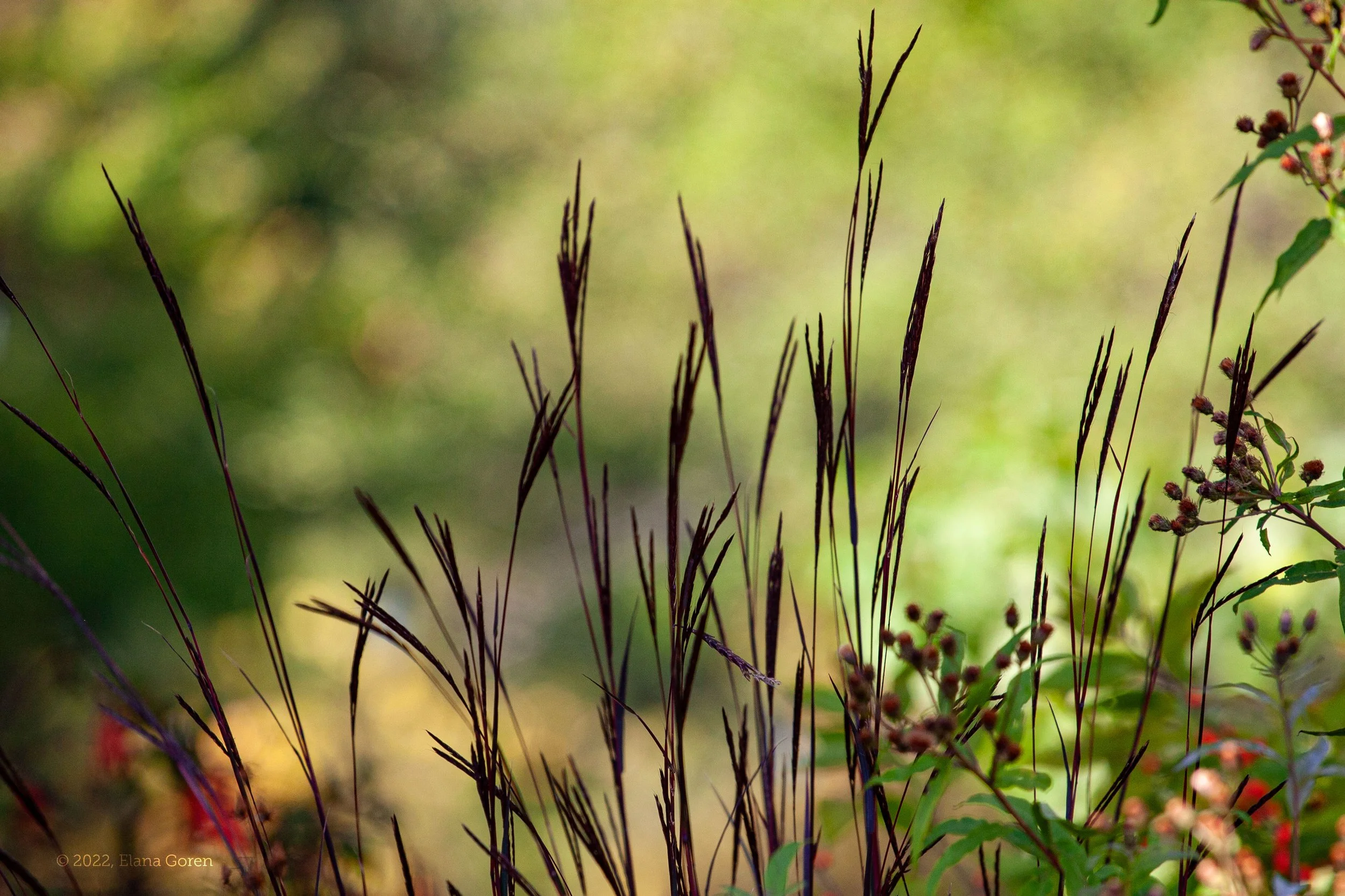 Andropogon gerardii ‘Blackhawks’ (Big Bluestem). Tall, native grass with amazing dark purple stems that arise through the summer. Blooms in September.
