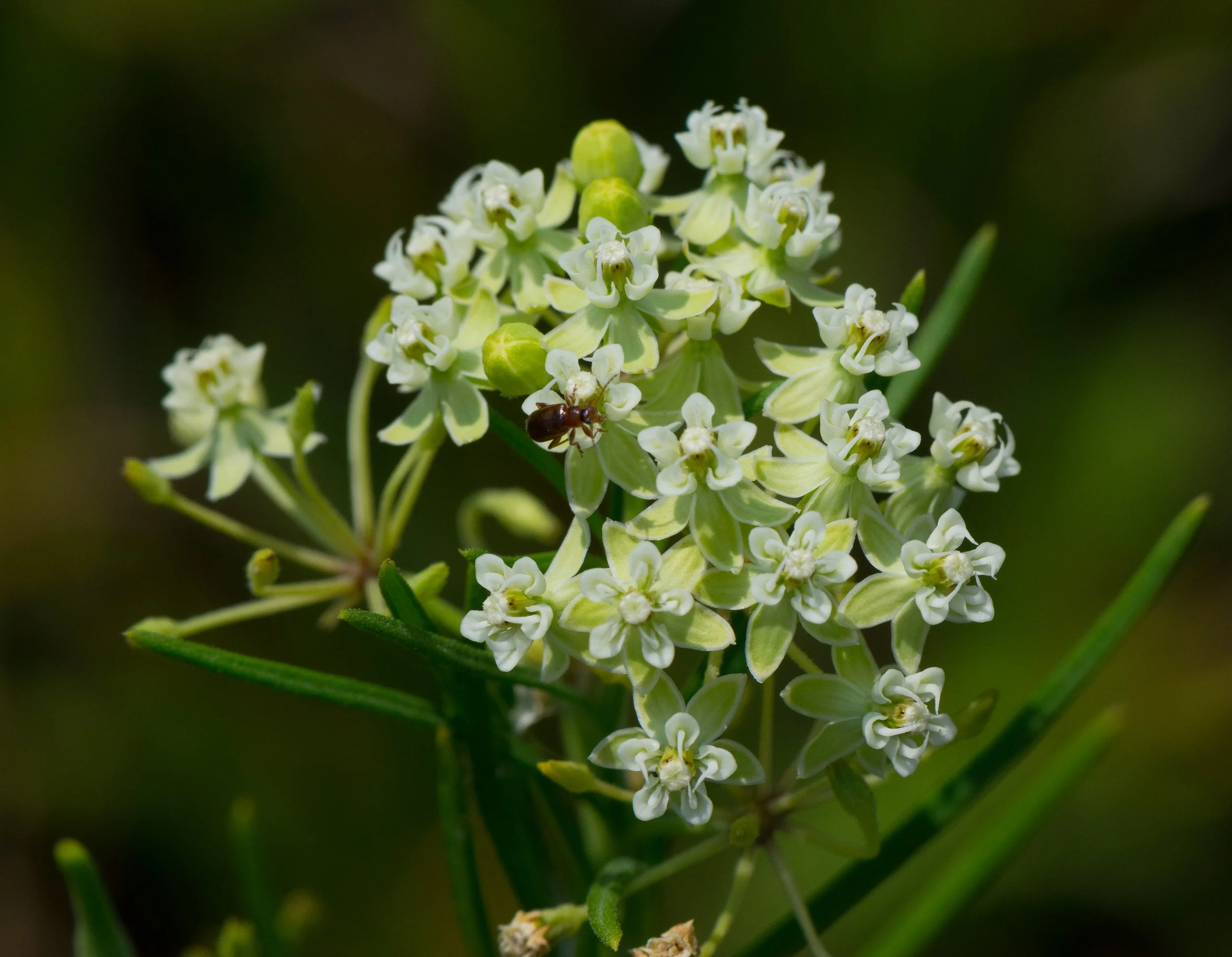 Asclepias verticillata (Whirled Milkweed). Delicate, tall Milkweed variety with white flowers. Pollinator favorite! Blooms all summer.