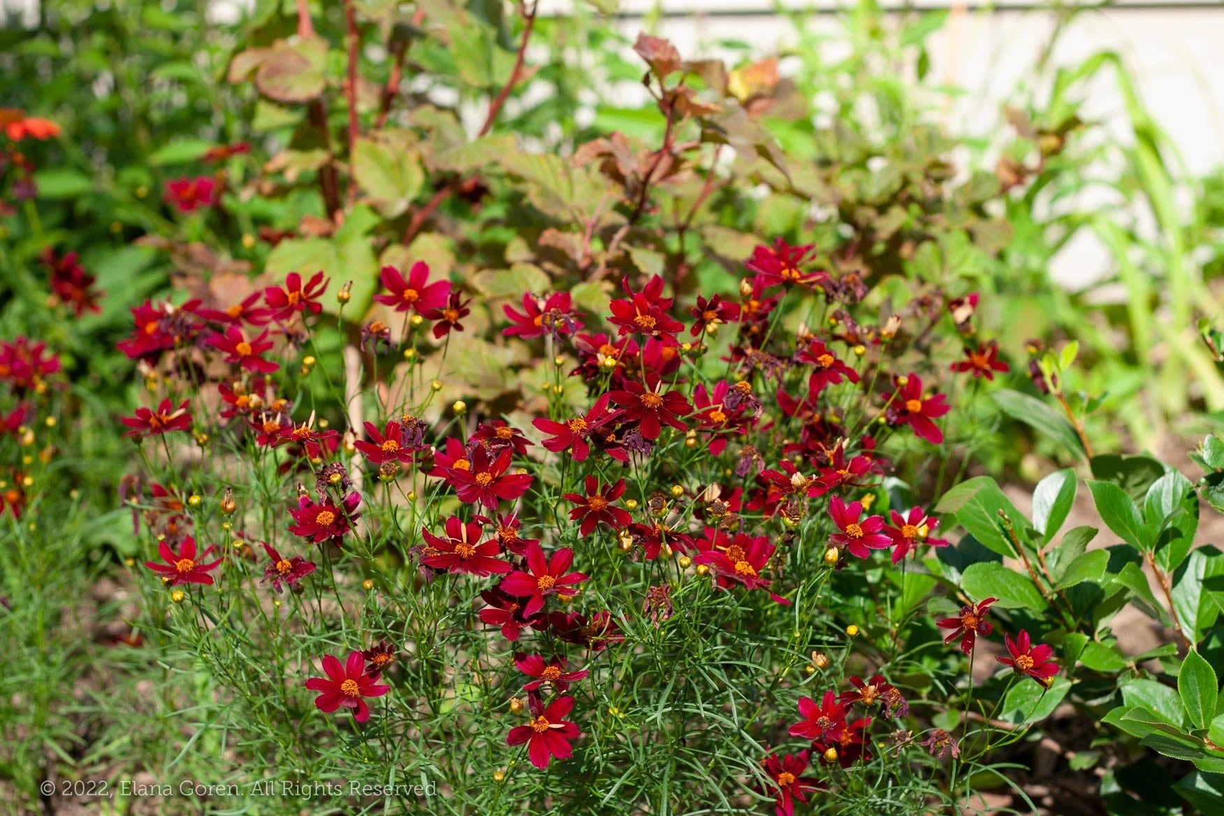 Coreopsis ‘Red Satin’ (Red Tickseed). A nativar of Threadleaf Tickseed, this drought-tolerant, red-flowered variety blooms from June – August.