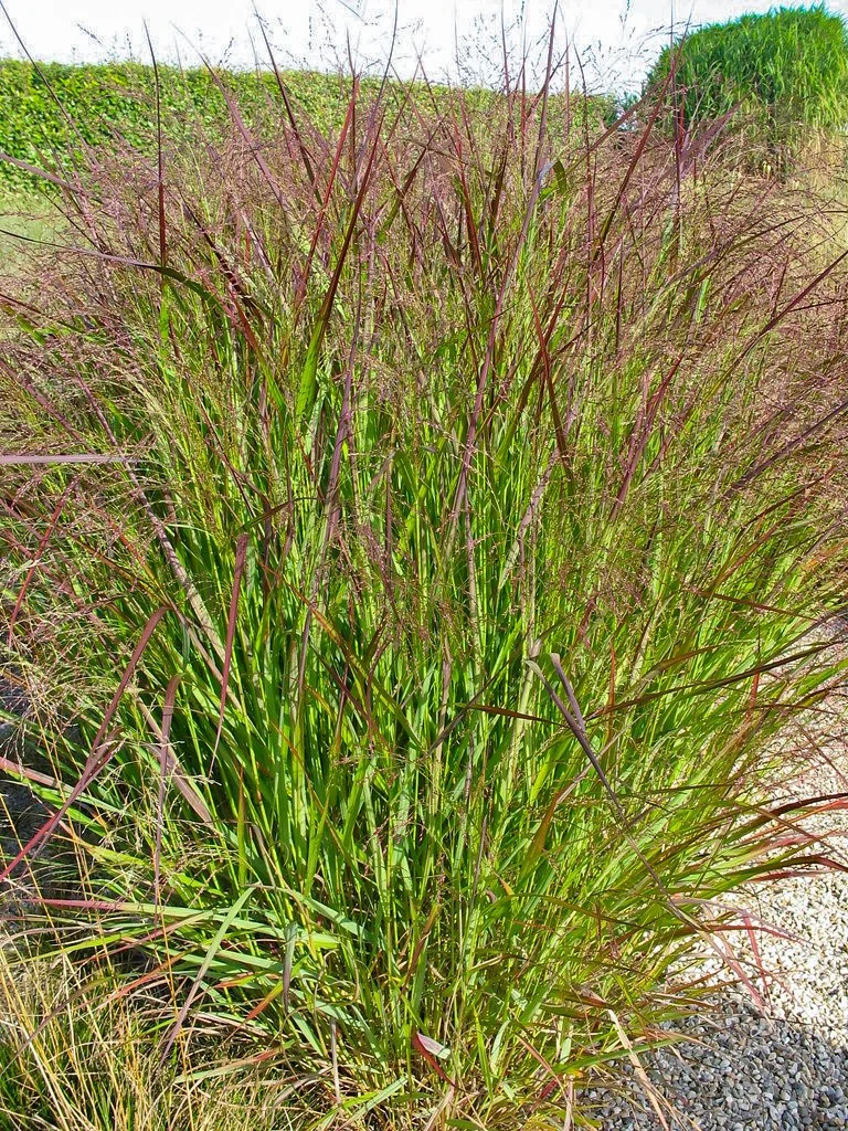 Panicum virgatum 'Ruby Ribbons’. Warm season grass with bright red blades mixed in with the green ones. Blooms mid-summer.
